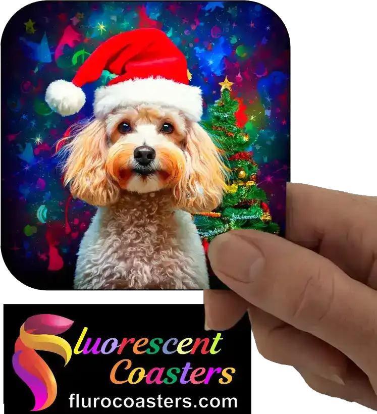 Fluorescent Coasters - White Poodle Dog Wearing Christmas Hat 2, Festivities / Religion, 402393
