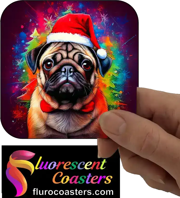 Fluorescent Coasters - Pug Dog Wearing Christmas Hat 1, Festivities / Religion, 402446